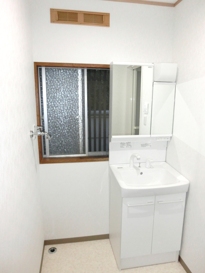 洗面所は洗濯機の位置を動かせるように配管位置を変えて、鏡付きの洗面台を取り付けられるように窓枠部分に下地を組んで取り付けました。