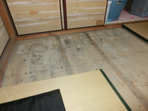 床地をめくってみると、色が変色するほど湿気が回っていました。普段生活している上でなかなか気がつかない所ではあるので、皆さまも少しでも気になることがありましたらご相談ください。